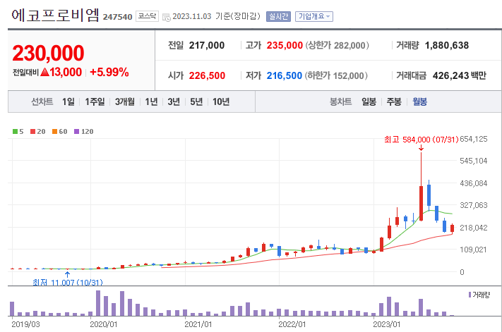 2016년 5월 1일 분할기일로 에코프로 2차전지 부문이 물적분할되어 신설됐습니다. 그리고 2019년 3월 코스닥에 상장된 회사입니다. 2013년 하이니켈계 양극소재 중심으로 사업을 재편하여 NCA분야에서 시장점유율을 지속적으로 높여왔으며, 양극재 수요 확대와 EV용 하이니켈계 양극재 판매 호조로 세계 시장 점유율을 높여 나가고 있습니다.