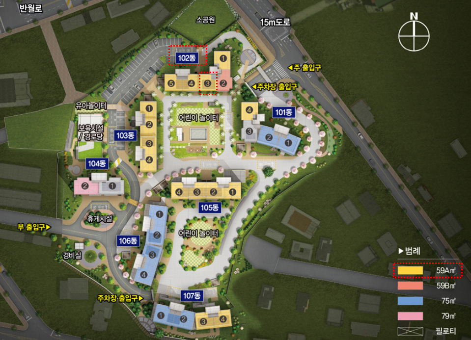 102동은 주출입구 우측에 위치하며, 주차가 편할것으로 예상되며 놀이터 뷰를 가지게 됩니다.