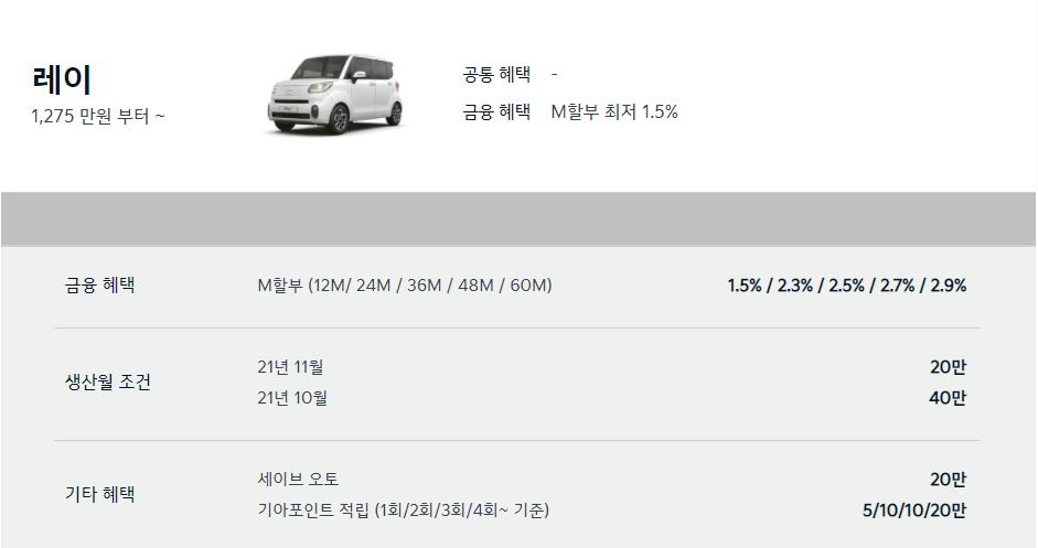 22년 1월 레이는 1275만원 부터 시작합니다.