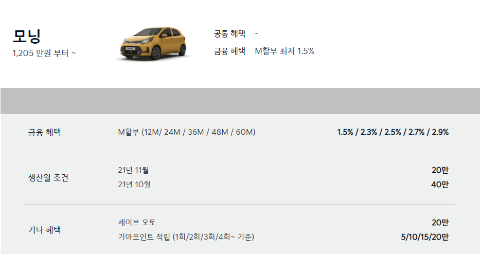 22년 1월 모닝은 1205만원 부터 시작합니다.