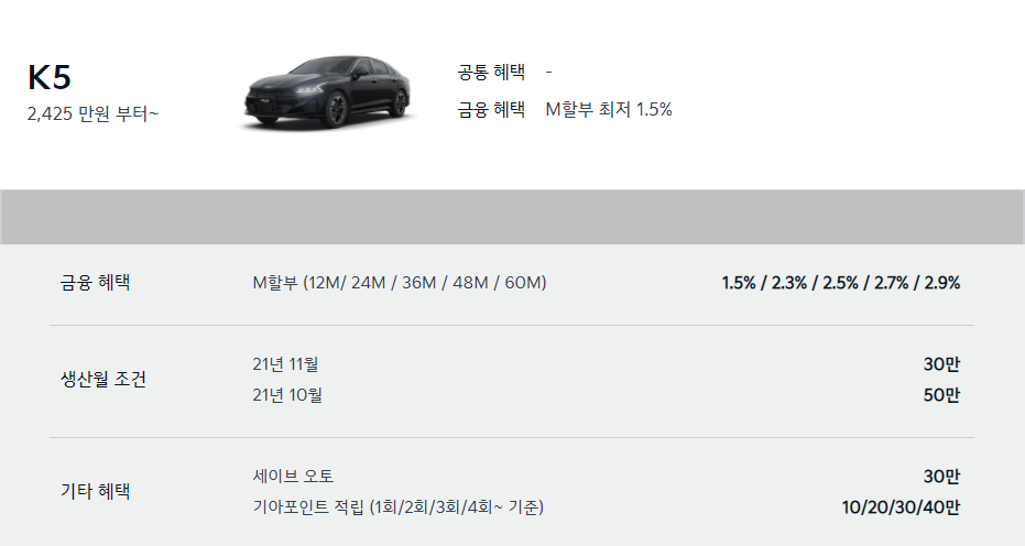 22년 1월 k5는 2425만원 부터 시작합니다.